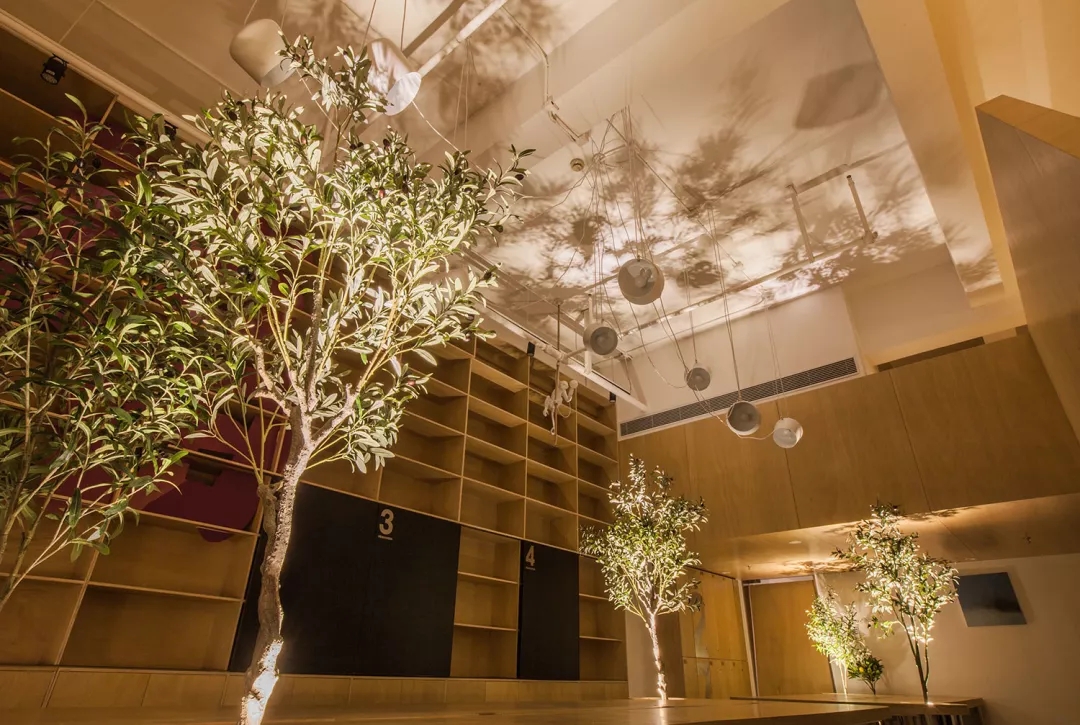 辦公桌與樹的結(jié)合,成為了整個空間的內(nèi)景觀,也與外面的綠色形成呼應(yīng),消減以往辦公的緊張氛圍。整墻的書架也不甘無趣,在實用的框架下,產(chǎn)生一絲波動的起伏,如同山崖,如同坡面。