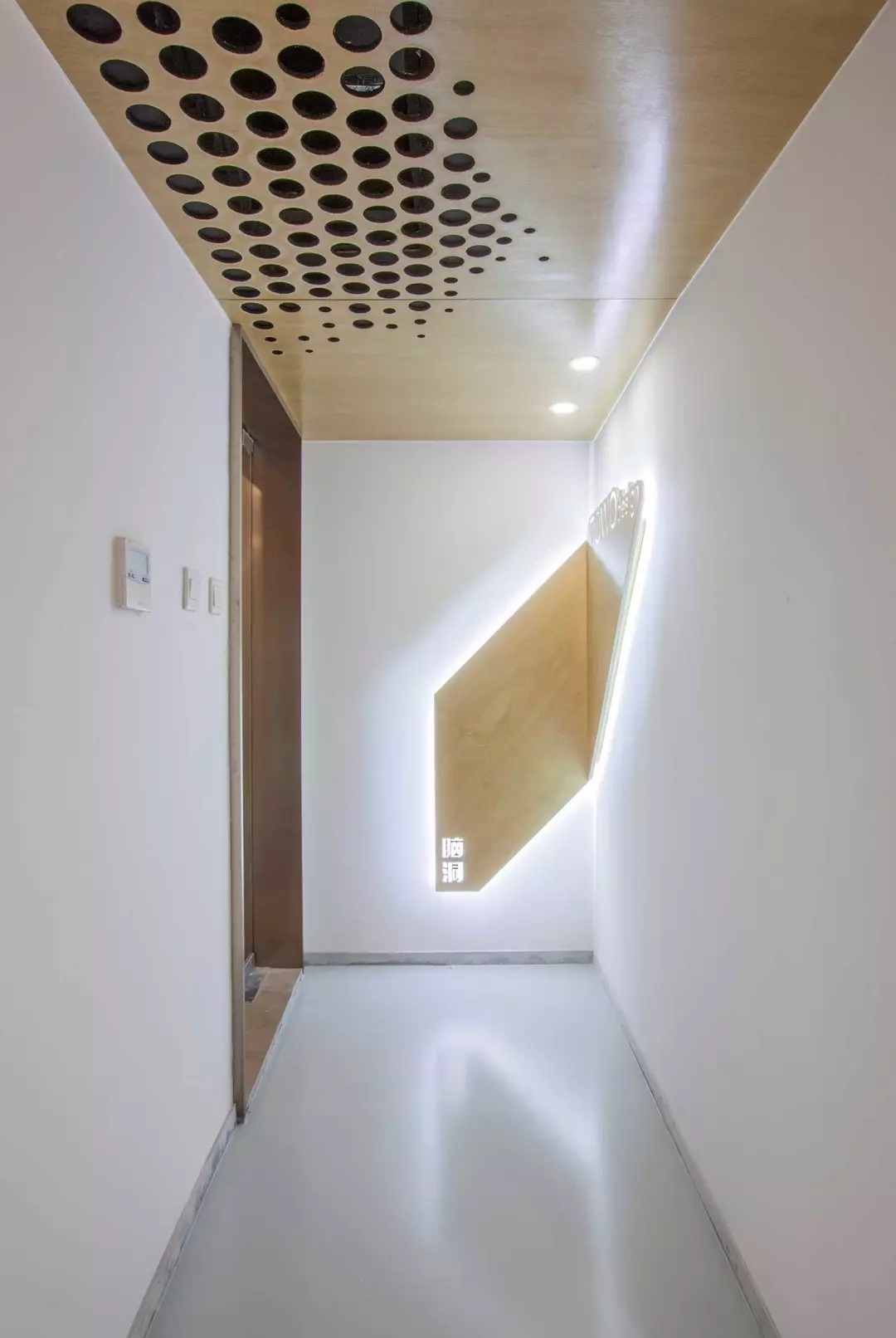 功能融于樂趣與創(chuàng)意,兩個空調(diào)的回風(fēng)孔也不能放過,市面上的百葉口為了實用而完全無法融入環(huán)境。由于吊頂也屬于木質(zhì)體塊,所以經(jīng)過試驗,一個充滿漸變的點陣圖形,解決了這個問題,不同規(guī)格的開孔器進過精心布置并開洞,讓空間回歸純粹與樂趣。