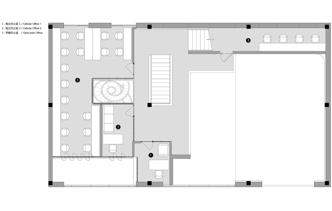 ASTUDIO攝影工作室位于CBD東側菁英谷文創(chuàng)園內,整體的設計風格融合了粗狂工業(yè)風和現代簡約風。原有建筑為雙層的廠房空間,這種大空間非常適合拍攝的需求。攝影師希望把這個大空間改造為兩個相對獨立的拍攝區(qū),并且有各自獨立的化妝間和出入口,從而可以同時進行兩場獨立的拍攝。UUA將原有的二層建筑在豎向上改造成為了三層的空間,其中第一層包含接待區(qū)和1號拍攝區(qū),第二層整體為辦公空間,第三層是2號拍攝區(qū),這種豎向上的分區(qū)保障了兩場同時拍攝的獨立性。