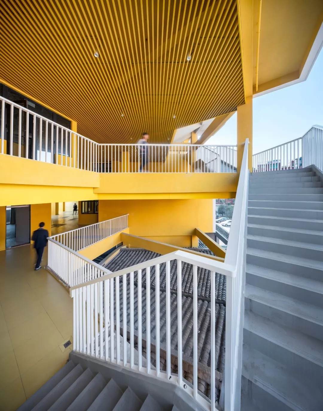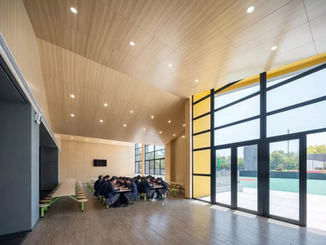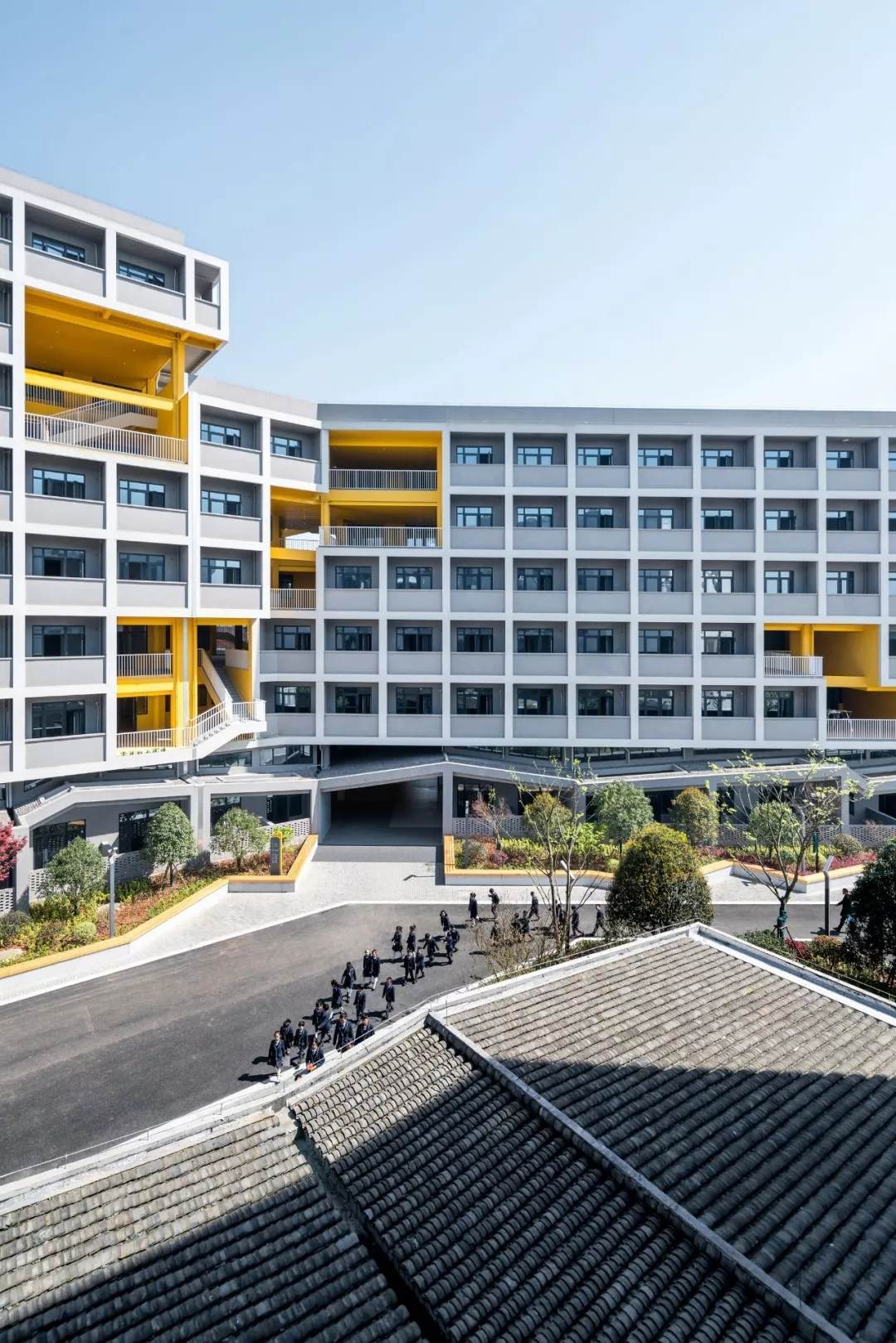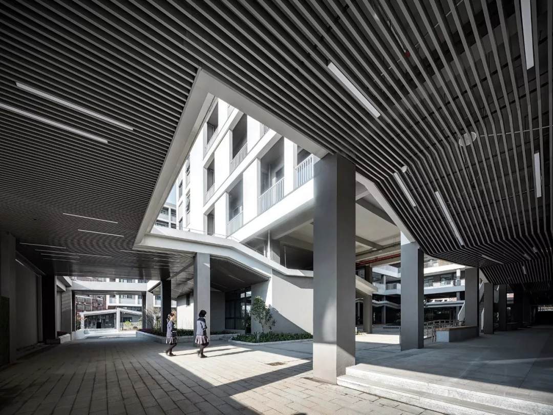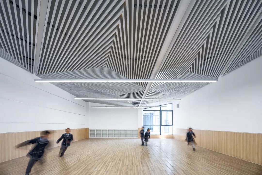 校園首層裙房的折面屋頂鋪滿了小青瓦,是中國(guó)傳統(tǒng)建筑中最常見(jiàn)的一種材料之一。從上層建筑向外眺望就可以看到,瓦片不僅起到建筑屋面保溫防水的作用,還為整個(gè)校園帶來(lái)了一份優(yōu)雅和淡然。
