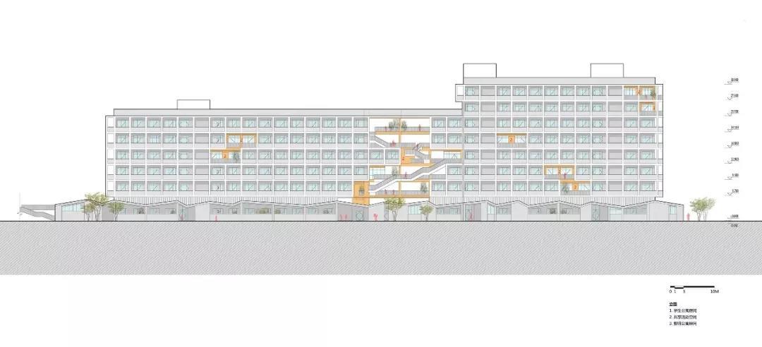 公共教學(xué)用房以及校園公共空間鋪開(kāi)布置在首層,以使校園公共活動(dòng)更多的在首層發(fā)生;教學(xué)樓、宿舍和風(fēng)雨操場(chǎng)等建筑體量布置在二層及以上,以保證良好的日照、采光和通風(fēng)。這樣的布置的策略是將大量同質(zhì)化的教學(xué)單元集中布置,將節(jié)約下來(lái)的土地空間留給公共教學(xué)單元和公共空間,這也與新世紀(jì)外國(guó)語(yǔ)學(xué)校的小外交官教學(xué)體系高度契合。