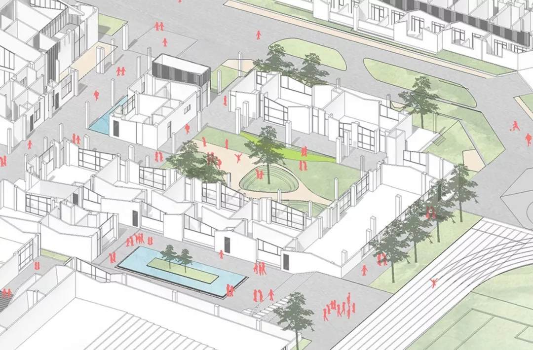 為此,校園中的教育活動(dòng)場(chǎng)所不應(yīng)僅著眼于教室,而是以城市規(guī)劃的視野作為出發(fā)點(diǎn)。校園首層的建筑形態(tài)以當(dāng)?shù)亟纤l(xiāng)的坡屋頂建筑為原型進(jìn)行排列組合,并置入了“街道”、“巷弄”、“院子”、“口袋公園”等有趣友好的場(chǎng)所,強(qiáng)化校園的“社區(qū)感”,“大街小巷”之間互相連通,并連接著一個(gè)個(gè)小而美、小而親的場(chǎng)所,生態(tài)開(kāi)放,恬靜安逸,為孩子們帶來(lái)“浸潤(rùn)式”的教學(xué)空間體驗(yàn),引發(fā)孩子們互動(dòng)玩耍、學(xué)習(xí)交流的熱情。