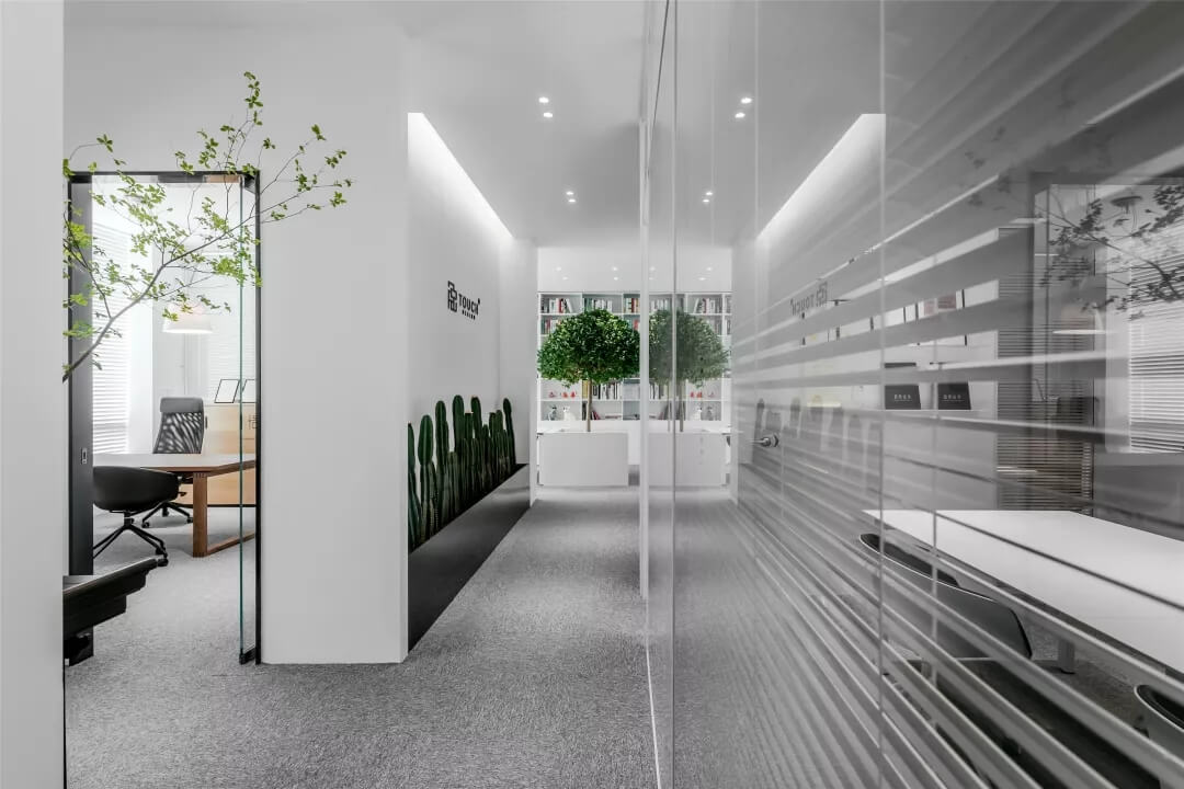 刪繁就簡,以最經(jīng)典的白色為主題搭配色調(diào),沒有繁瑣的辦公室設(shè)計和過多的裝飾,減去辦公中的壓抑感。通過將自然純凈的白色與沉靜黑色相結(jié)合,將品牌形象簡潔地呈現(xiàn)表達,同時為左右空間的過渡創(chuàng)建和諧觀感。純白的墻面,接近心靈的澄凈;仙人掌是視覺的焦點,恣意生長、堅韌、夯實根基,也正寓意著公司的設(shè)計理念:有所依、有所仗、有所長。