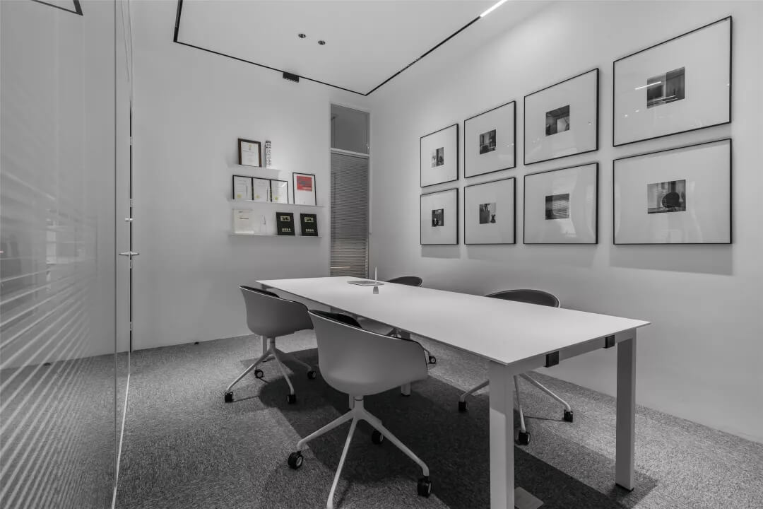 為了同時保證隱私和透明,張馳有道。會議室采用了玻璃+百葉窗的設(shè)計,這樣的交流區(qū)域保持彼此的通透與聯(lián)接,提升了場所的張力。使用貼合設(shè)計的局部掛畫藝術(shù),配以金屬的深邃感官,多媒體影視裝置加強了墻面空間的信息輻射作用。