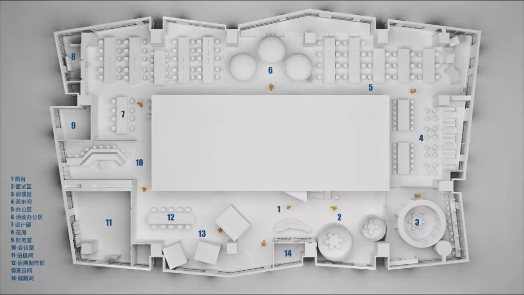 直播間在使用功能上相對獨立,且私密性較強,由三個方形盒子組合而成,并被安置于波浪造型的臺階上,中間穿插熱帶植物進行點綴,使使用者仿佛置身于椰林樹影,水清沙白的陽關(guān)海灘。在這里,不僅能夠使工作人員身心放松地完成節(jié)目的錄制工作,同時,空間的層次營造也給予觀賞者強有力的視覺沖擊力,將文化與藝術(shù)的融合達到了一個新高度。
