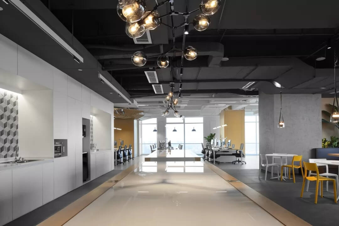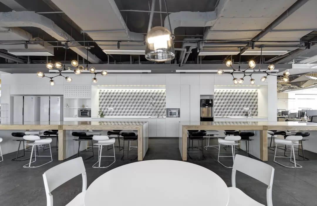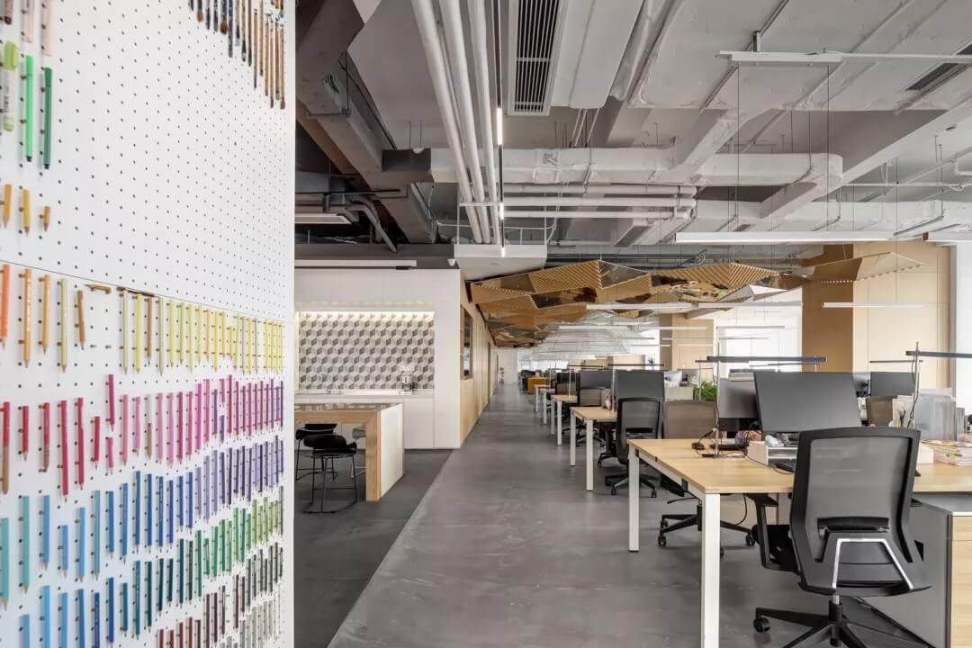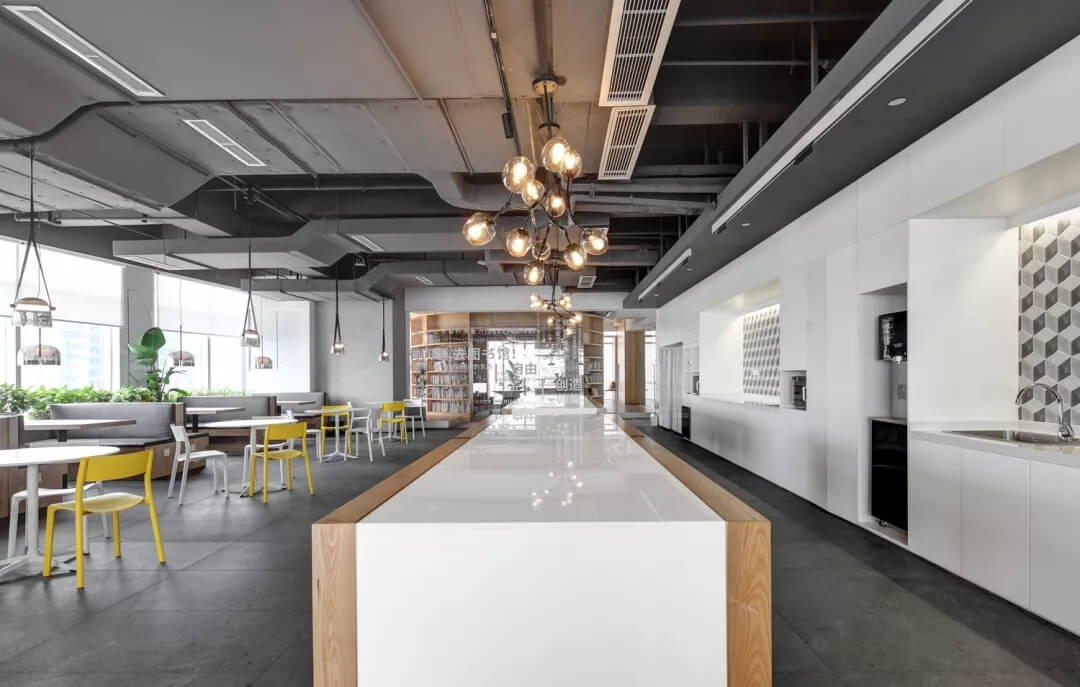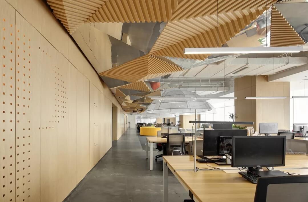 穿越員工休息區(qū),就到達了辦公室的員工工作區(qū),這里采用局部吊頂?shù)脑O(shè)計,由三角形元素組合而成的“鉆石吊頂”劃分了空間頂部構(gòu)成,挑戰(zhàn)了使用者的視覺體驗,不僅豐富了辦公區(qū)域的層次,同時也增加了空間的趣味性。