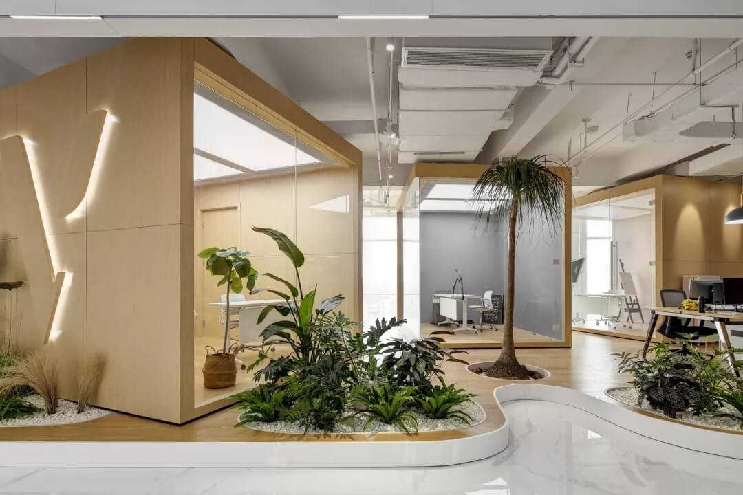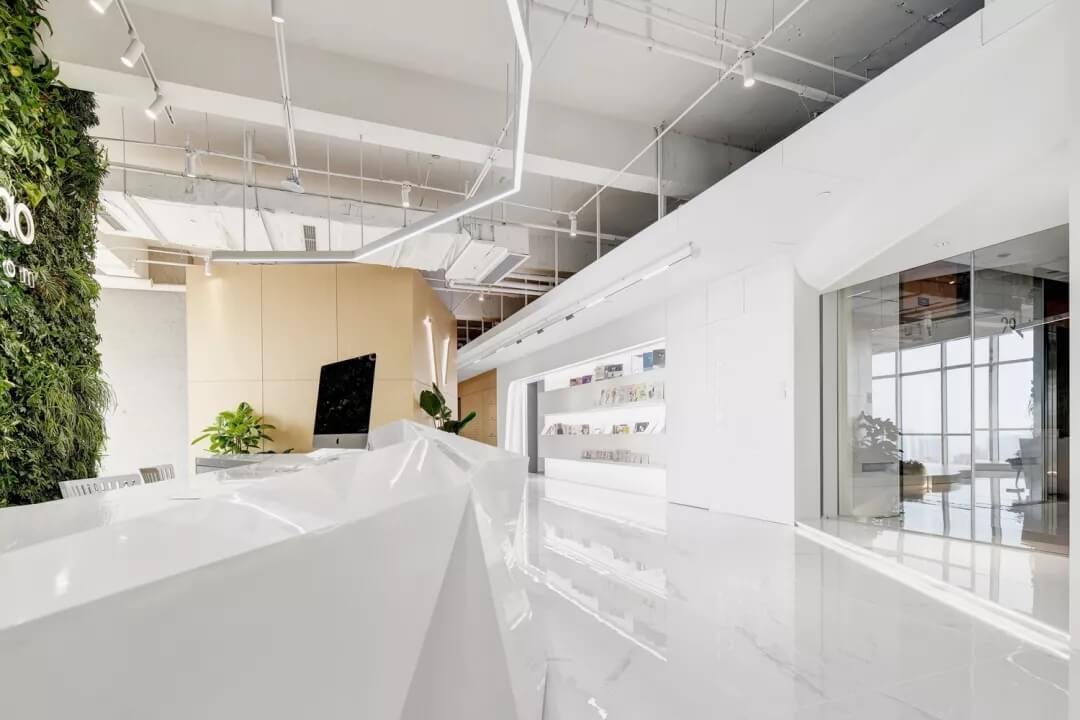 門廳接待處背景墻設(shè)計采用真實植物進行裝飾,構(gòu)成生態(tài)的室內(nèi)空間,提升空間使用的舒適度。前臺的設(shè)計運用體塊切割的方式做成不規(guī)則的形狀,以到達從不同的角度觀看到的場景都處于變化的狀態(tài)當(dāng)中。