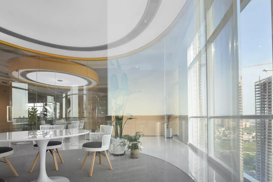 活動辦公區(qū)的圓頂造型再次運用了“圓形”元素,使得空間首尾呼應(yīng)。圓形的劃分使大面積的接待區(qū)在使用上更加靈活,網(wǎng)紗狀燈罩的設(shè)計增加了空間視覺上的朦朧感,使空間的使用更具舒適性。