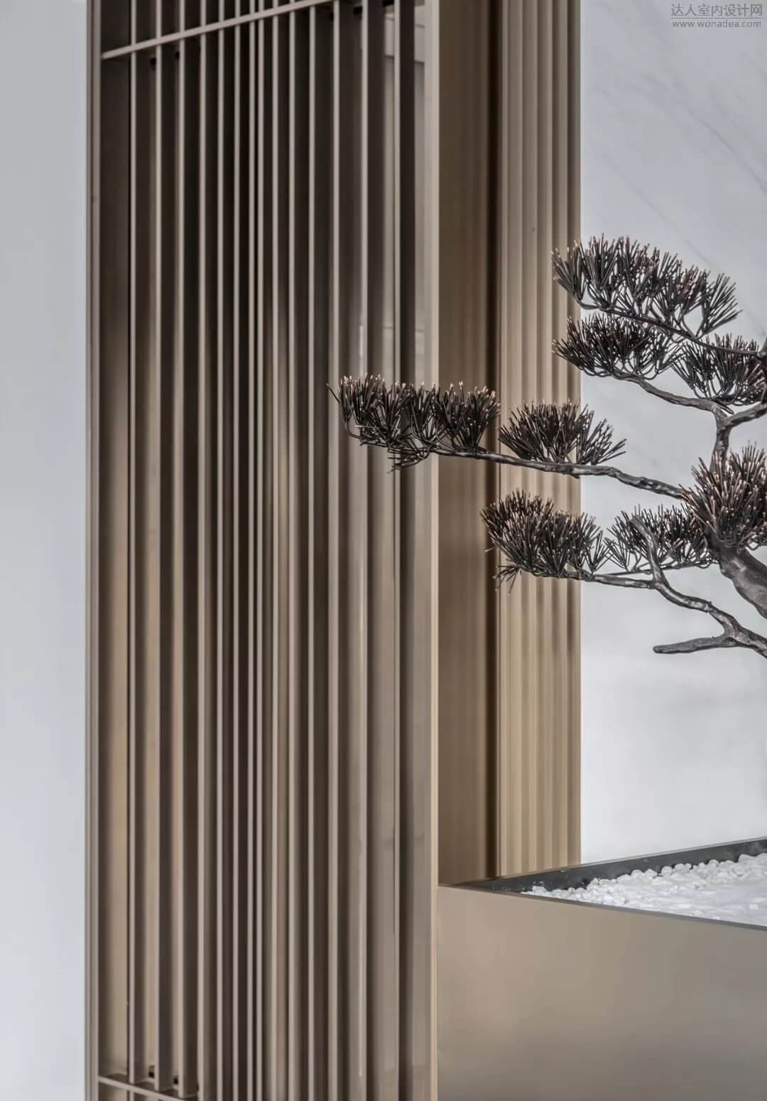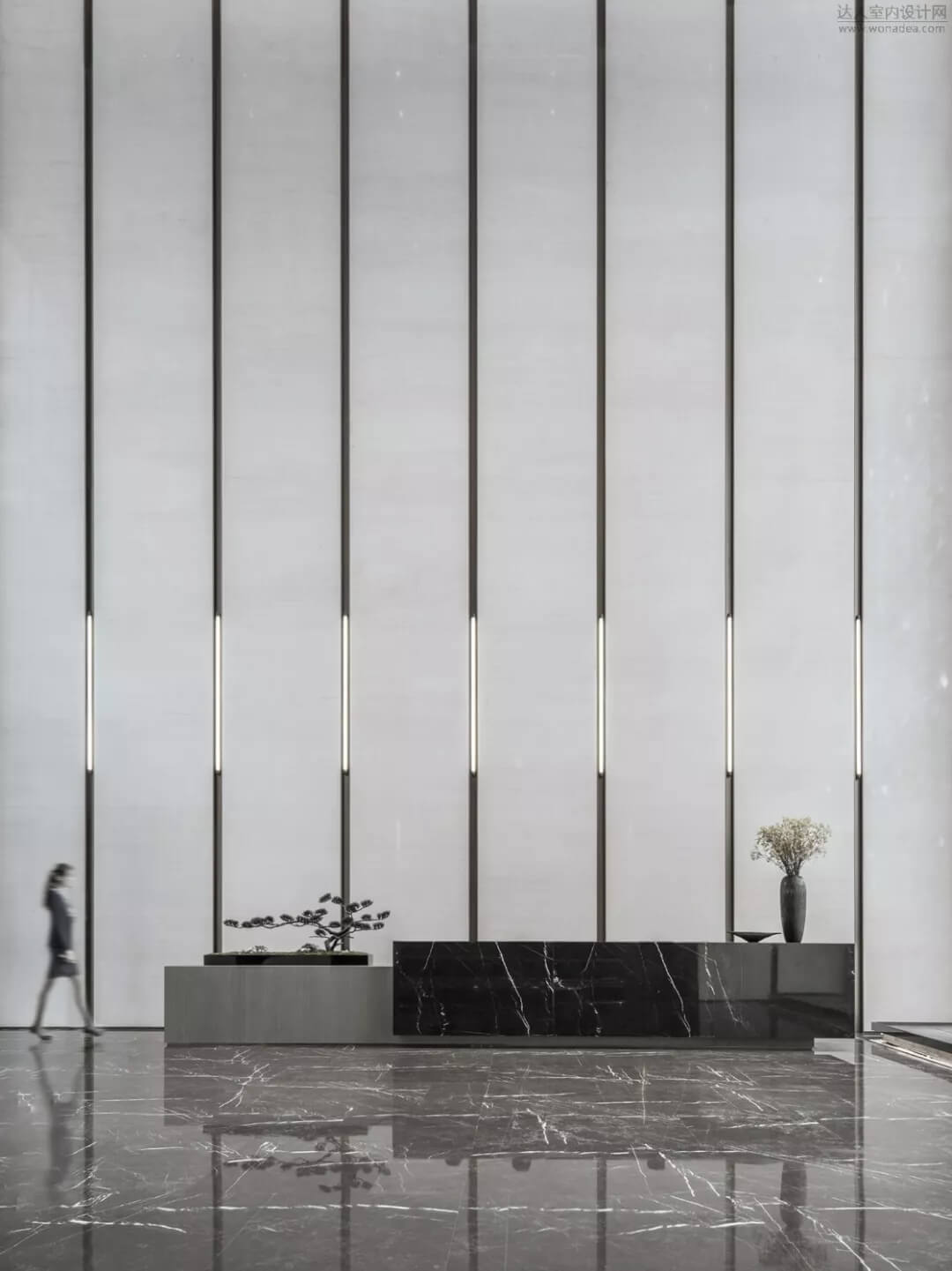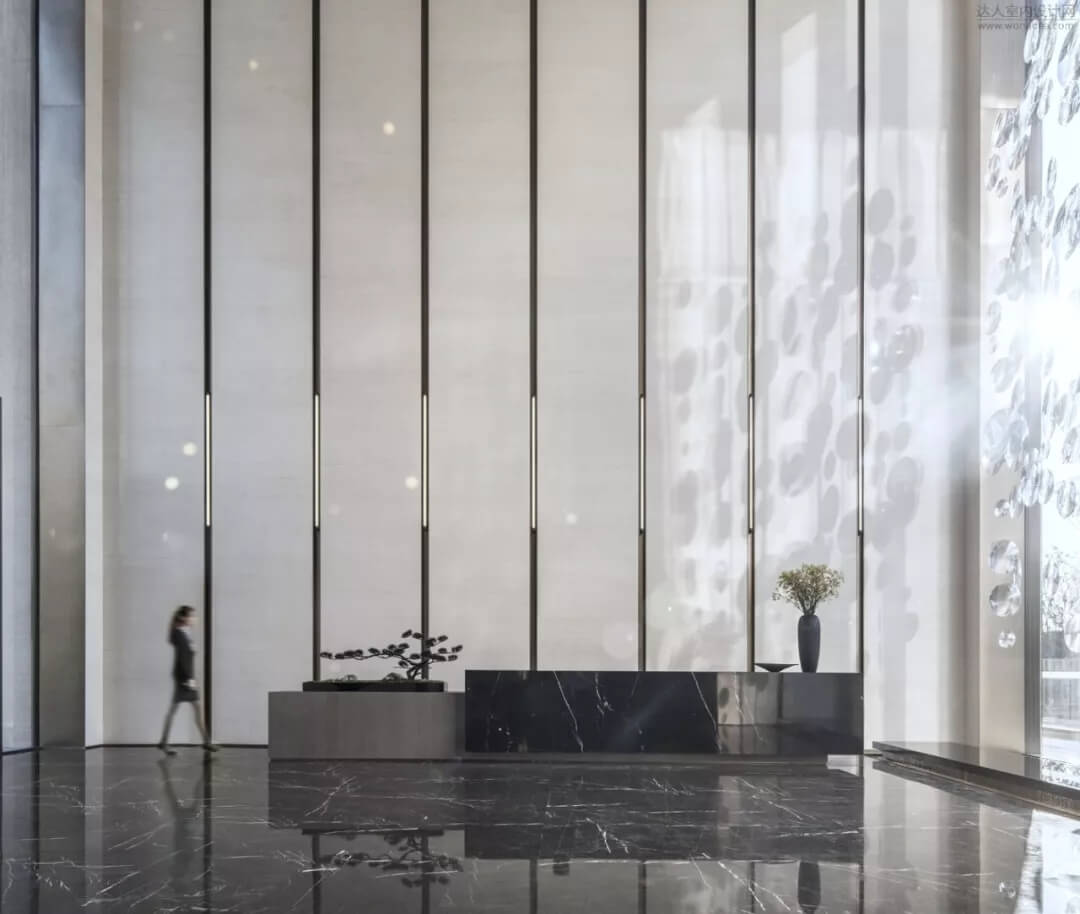 通過(guò)豐富的景觀區(qū)進(jìn)入門(mén)廳,感受到空間的空靈,立面設(shè)計(jì)過(guò)濾了來(lái)自于外界的繁復(fù)。十米挑空的大廳,墻面以米色砂巖為基底,黃銅色金屬?gòu)?qiáng)化縱向的比例,凸顯出空間的氣勢(shì)。入口對(duì)景設(shè)置的水景讓穿梭其中的訪客仿若能傾聽(tīng)到潺潺水聲,同時(shí)水景和懸掛的軟裝裝置相得益彰,充滿(mǎn)巧妙的用意,同時(shí)也分隔了挑高通透的玻璃幕墻,虛實(shí)結(jié)合,體現(xiàn)現(xiàn)代設(shè)計(jì)的東方神韻。