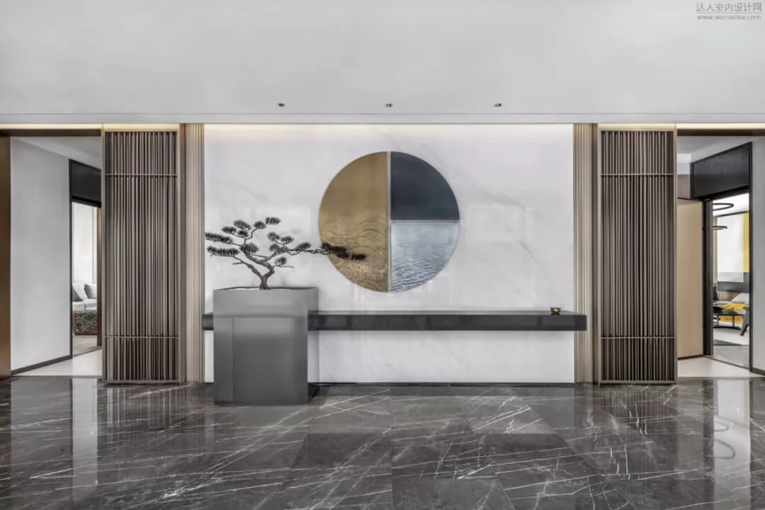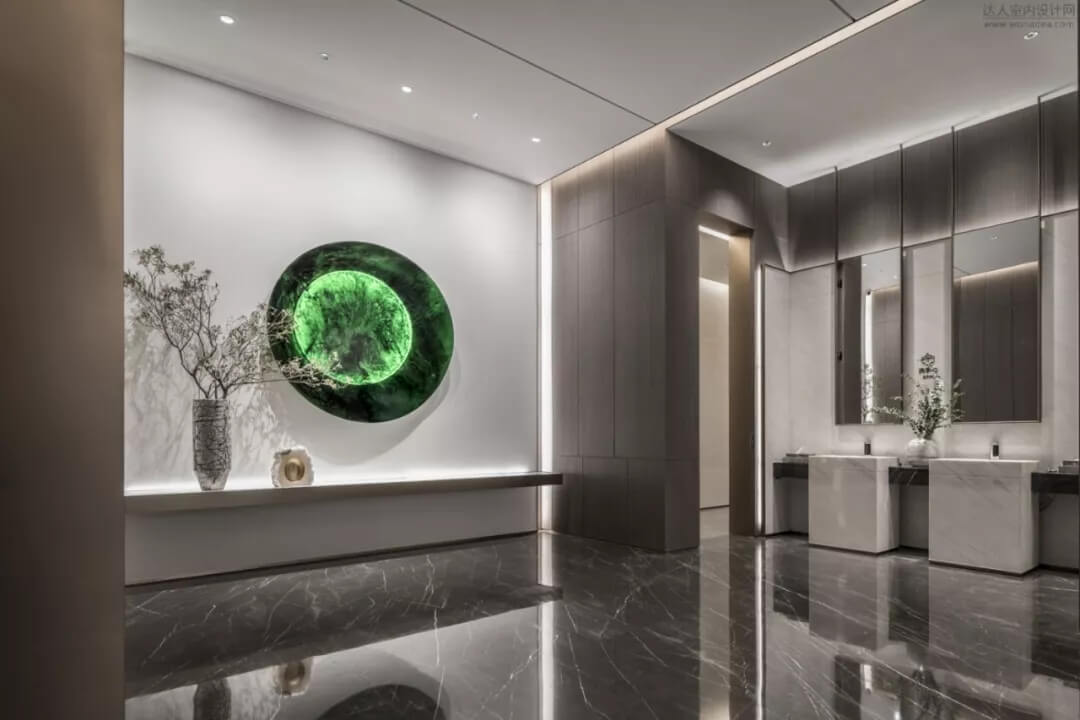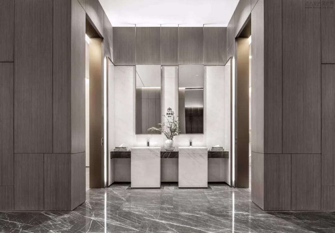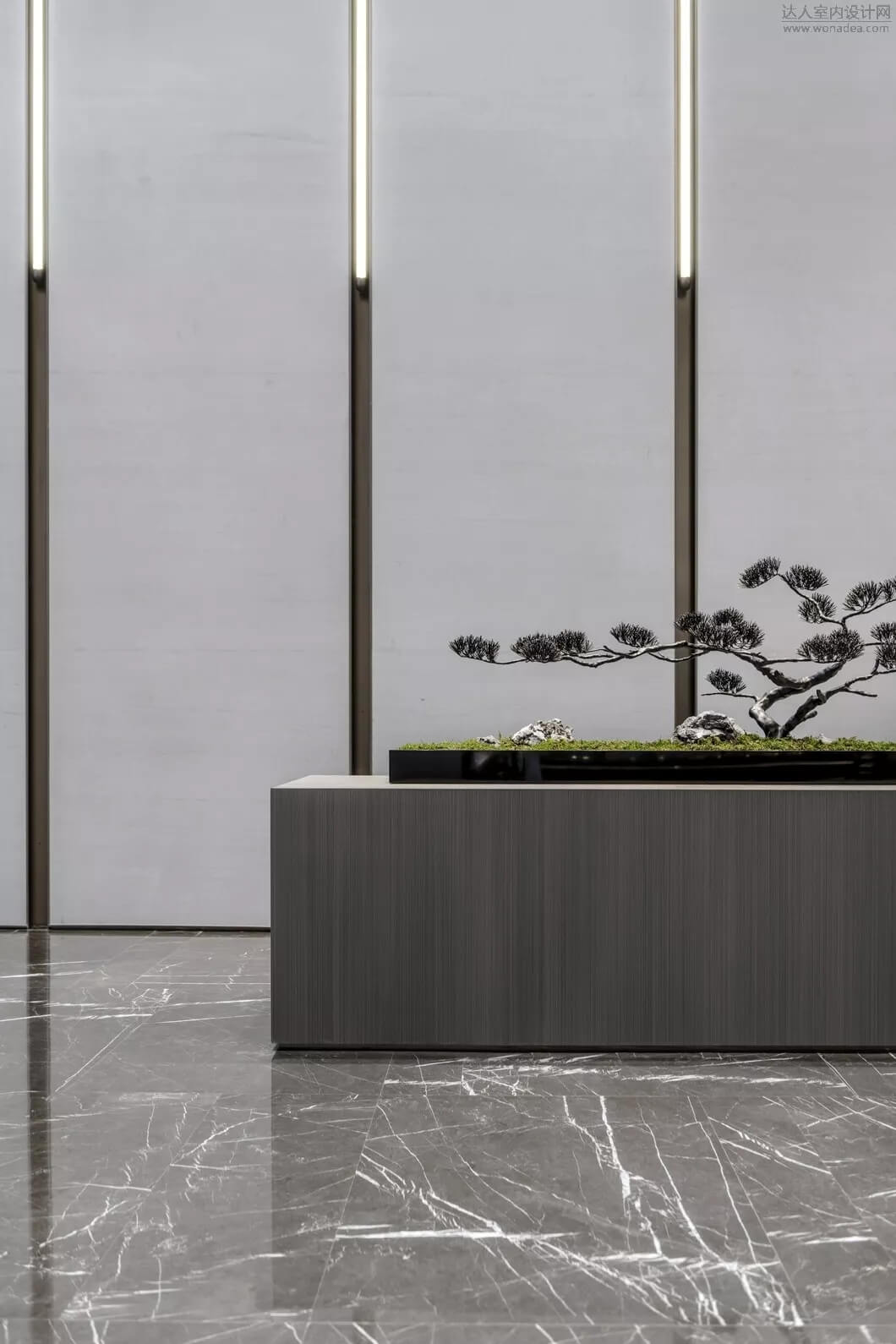 通過(guò)豐富的景觀區(qū)進(jìn)入門(mén)廳,感受到空間的空靈,立面設(shè)計(jì)過(guò)濾了來(lái)自于外界的繁復(fù)。十米挑空的大廳,墻面以米色砂巖為基底,黃銅色金屬?gòu)?qiáng)化縱向的比例,凸顯出空間的氣勢(shì)。入口對(duì)景設(shè)置的水景讓穿梭其中的訪客仿若能傾聽(tīng)到潺潺水聲,同時(shí)水景和懸掛的軟裝裝置相得益彰,充滿(mǎn)巧妙的用意,同時(shí)也分隔了挑高通透的玻璃幕墻,虛實(shí)結(jié)合,體現(xiàn)現(xiàn)代設(shè)計(jì)的東方神韻。