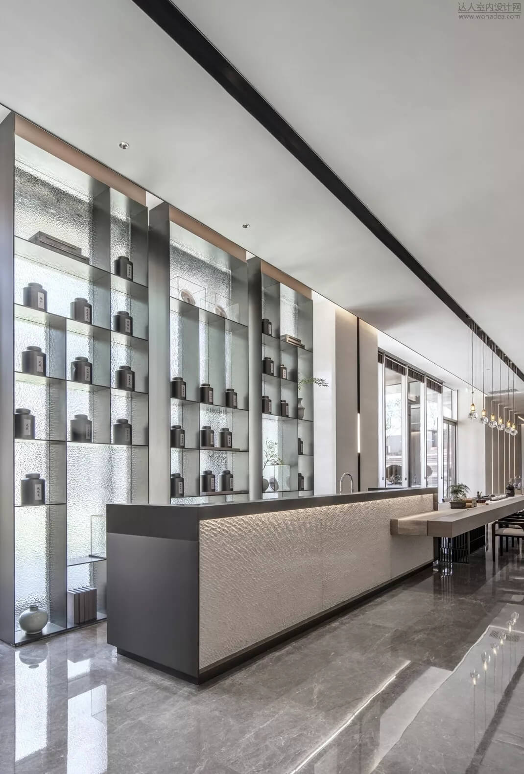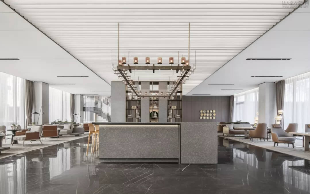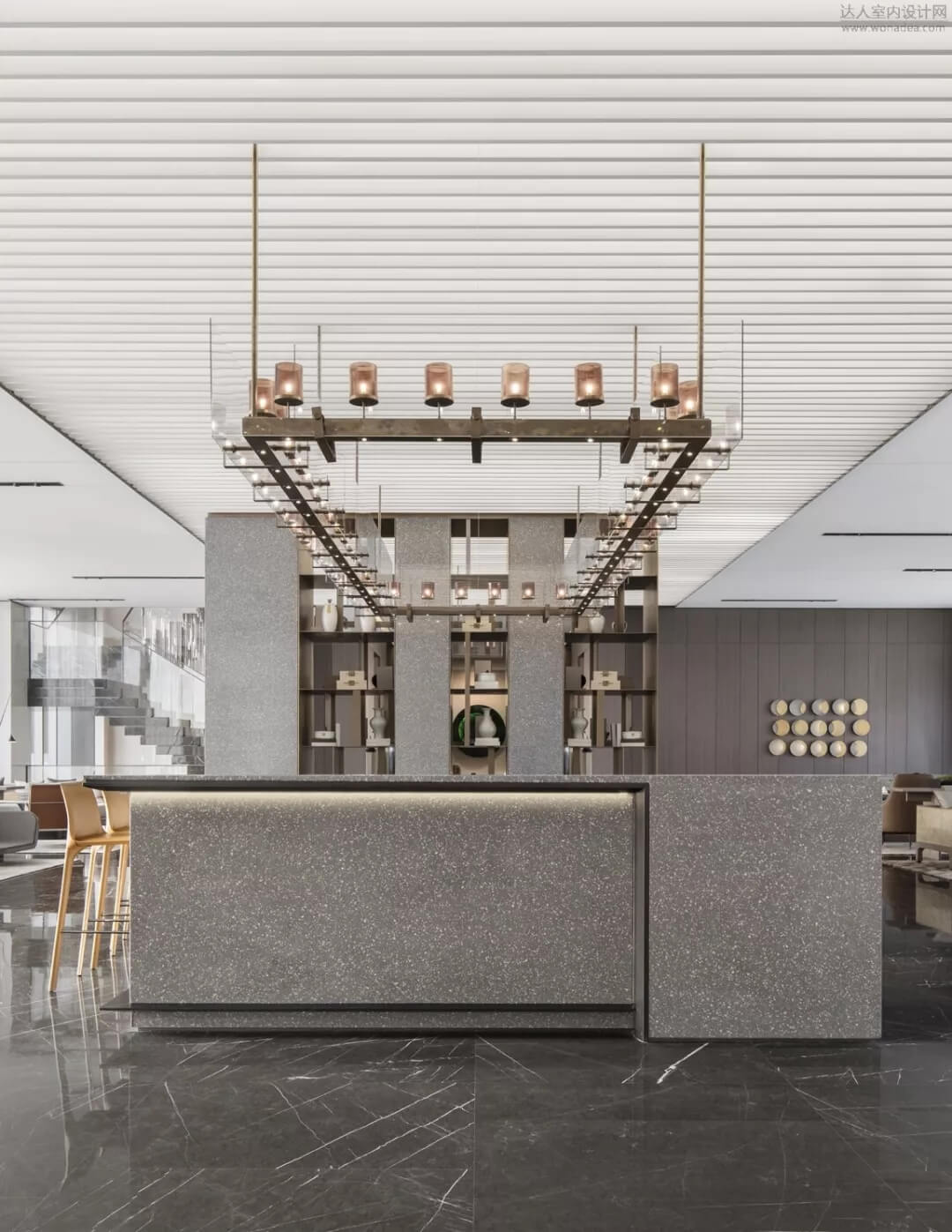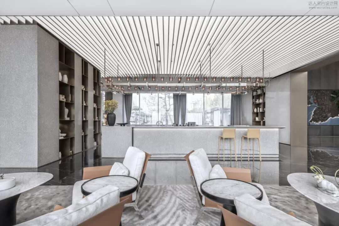 進(jìn)入洽談區(qū)大廳,通過(guò)大面積全明落地玻璃窗,最大程度地將室外的建筑、景觀效果納入室內(nèi)視野,以觀景式空間概念記錄時(shí)移景易的歲月縮影。圍合形的水磨石吧臺(tái)猶如藝術(shù)裝置,成為空間的中心焦點(diǎn)。
