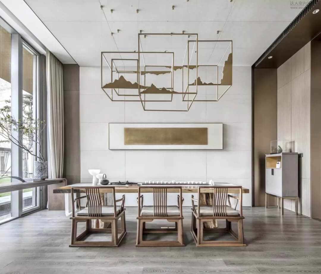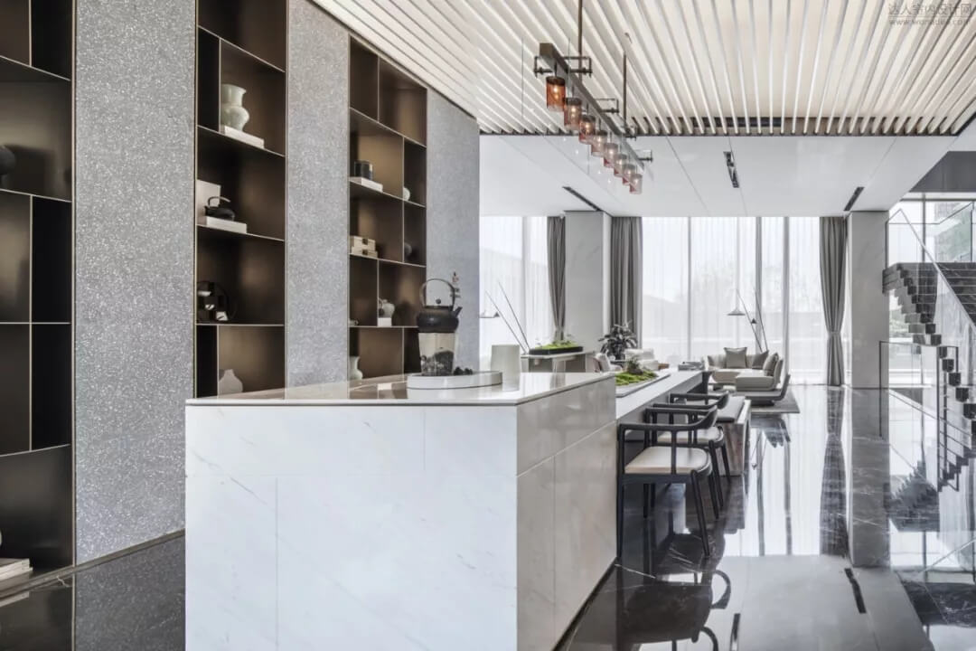在會(huì)所品茶水吧臺(tái)區(qū)結(jié)合枯山水造景,色彩雅致內(nèi)斂,充分展現(xiàn)了中國(guó)人素來(lái)喜愛(ài)的‘靜’,同時(shí)超長(zhǎng)條的品茶臺(tái),利用下沉庭院的景觀和室內(nèi)產(chǎn)生了互動(dòng),模糊了室內(nèi)外的界限。藝術(shù)儀式感的空間給人帶來(lái)思考的余地。