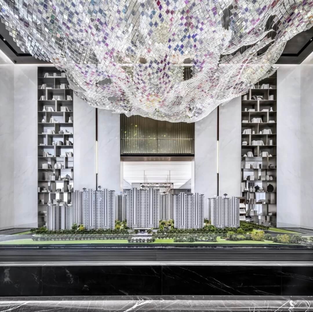 沙盤(pán)區(qū)墻面以大花白陶瓷板為主墻面,通過(guò)通高的黃銅書(shū)架體塊和金屬格柵,本身空間具有很強(qiáng)的中軸對(duì)稱(chēng)的儀式感,凸顯出空間的大氣。曼妙的波浪曲線,以流動(dòng)的韻律打破空間靜態(tài),同時(shí)從明亮空靈的大堂走入半圍合的沙盤(pán)區(qū),總能給人帶來(lái)新奇感,亦是詩(shī)意與藝術(shù)的格調(diào)升華。