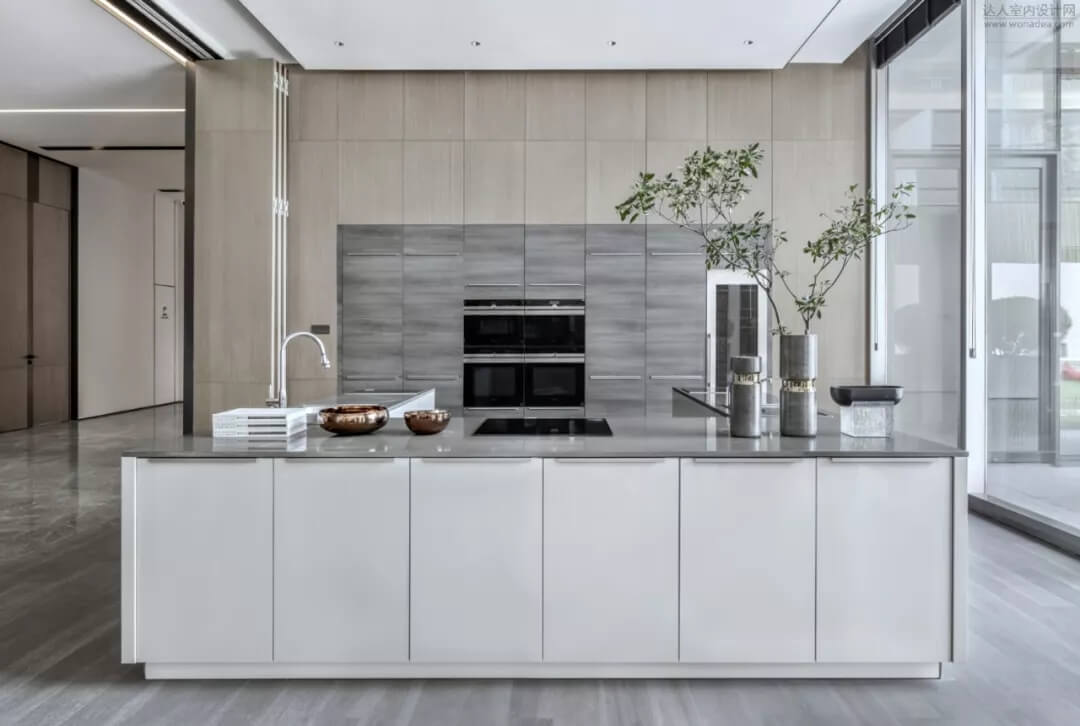 私宴,是以當(dāng)代設(shè)計(jì)來(lái)描繪文人飲酒時(shí)追求的清雅意境,寄情於山水??臻g通過(guò)折疊門(mén)和西廚吧臺(tái)區(qū)產(chǎn)生互動(dòng),空間功能既獨(dú)立又有相互滲透。延續(xù)簡(jiǎn)潔流暢的線條,布置與空間密切配合。