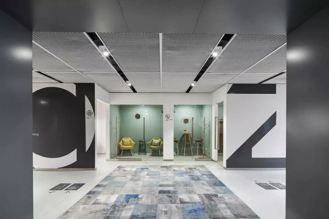 至于盒子以外的空間,我們想凝聚更多的人文藝術氣息,選擇較多地去鋪陳展示各種抽象的藝術線條和畫作,同時為了不失去生活氣息,各個角落選擇顏色比較跳躍的家居什物,讓它作為一個流動的戶外廣場,讓人可以自在穿行其中,偶爾停駐觀察,經得住人聲鼎沸的喧擾,亦能提供心靈靜憩的安寧。在這里,大家認真辦公、生活、盡情交流、分享,它就是一個安放綠意,有極高包容度的公共空間。