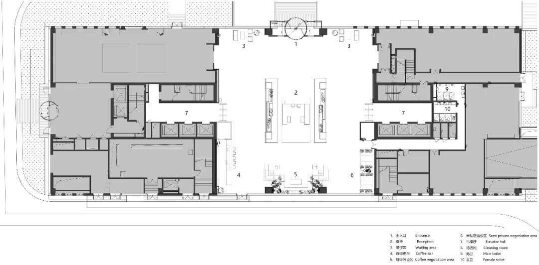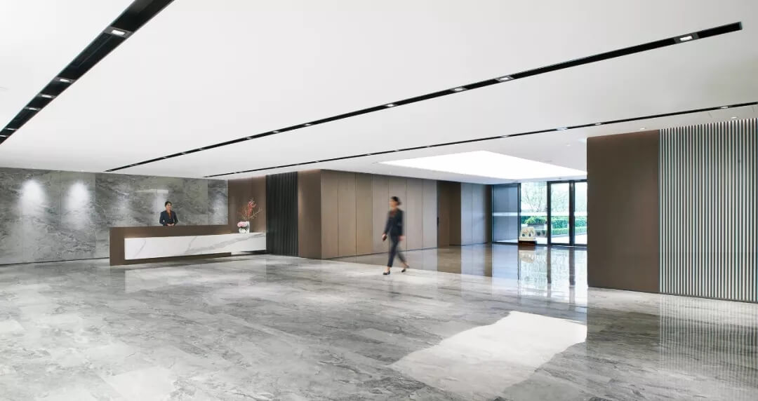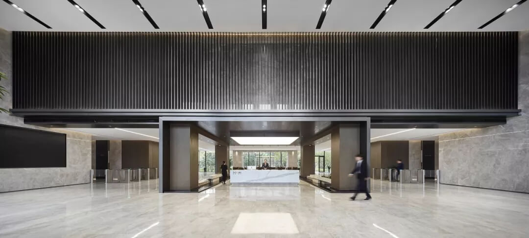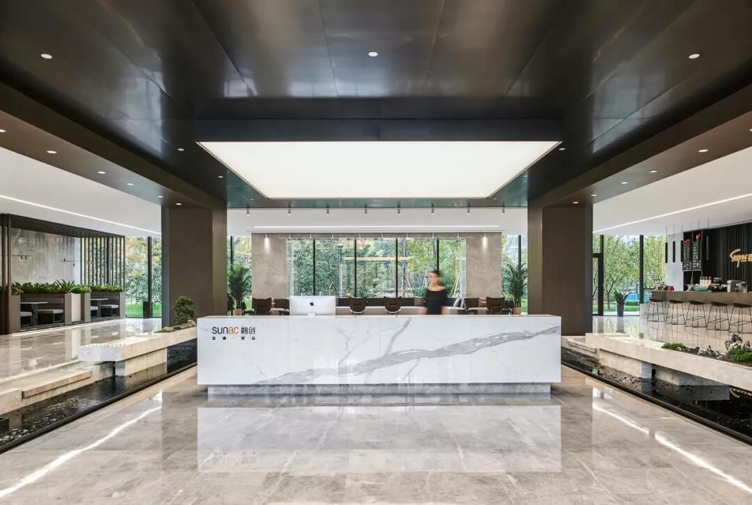 大堂是開放,通透,自然的園林式空間,自成一片天地。踏入大堂即可看到前廳接待島,方形四面通透的造型,嚴(yán)謹不失靈活,結(jié)合流動水景和盆景,營造了生態(tài)的,四季怡情的綠色辦公。電梯廳出入口在接待島兩側(cè),實現(xiàn)快速集散,避免上下班高峰期等候擁堵。咖啡等候區(qū)玻璃窗形成框景,把室外花園內(nèi)的四季變幻,自然元素都納入到室內(nèi)來,形成情景共融。