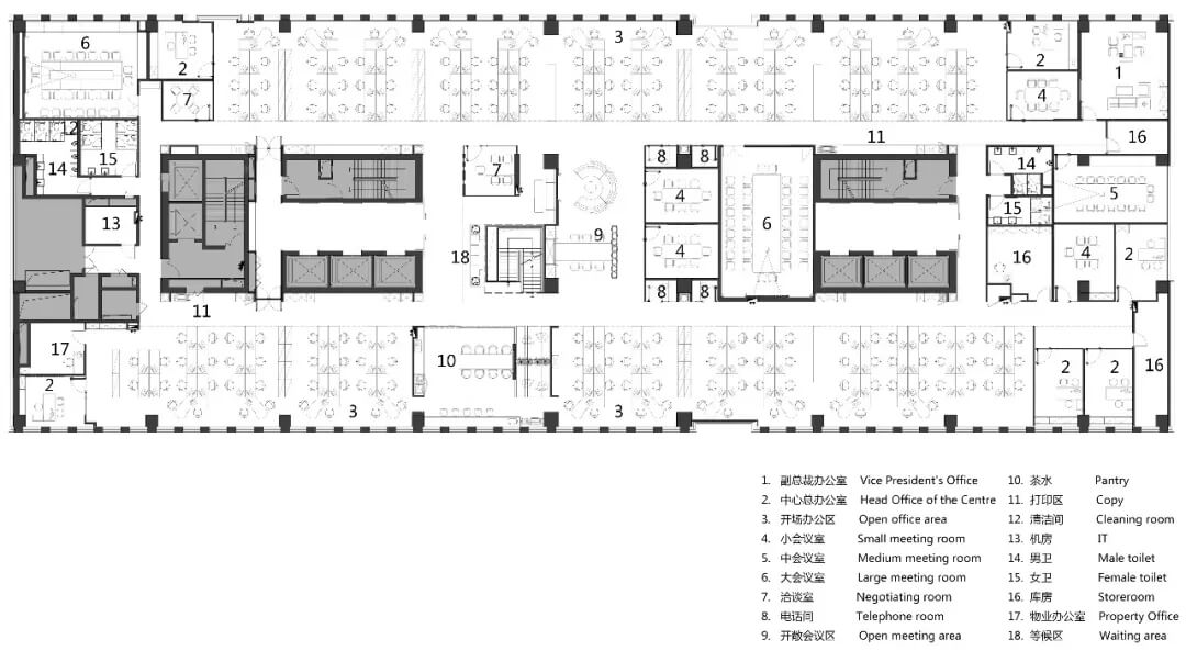 在空間規(guī)劃和功能布局上,兩側(cè)光線條件良好的區(qū)域設(shè)置開敞辦公區(qū);核心筒區(qū)增設(shè)存儲空間、電話間,洽談空間,會議室,滿足各種洽談會議需求;電梯集散口設(shè)置樓梯吹拔等候區(qū)、茶水區(qū)、景觀小品等開放共享和展示空間;采光較弱的中間區(qū)域,插入玻璃盒子做會議室。整個平面布局,在原建筑條件基礎(chǔ)上,融合融創(chuàng)需求,級級遞進,相互銜接。