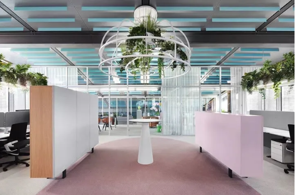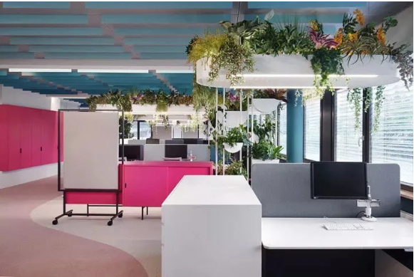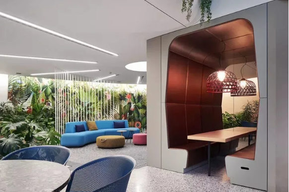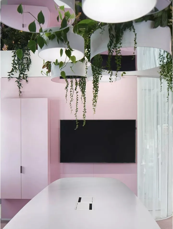 首先,設計團隊為這處工作場所增添了2100個超級盆栽植物。綠植能產(chǎn)生良好的情緒、降低精神壓力、促進創(chuàng)新、提高績效。此外,綠植還能改善空氣質(zhì)量、營造健康環(huán)境,并起到降噪的作用。它們只需定期澆水就能保持茂盛狀態(tài),因此深得人心。室內(nèi)盆栽植物具有強大的正能量。自從加入了這些綠化,室內(nèi)濕度不僅從18%增加到44%,讓人們的體感非常舒適,連員工的病假都減少了一半!