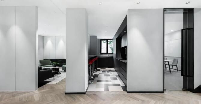 室內(nèi)為符合當(dāng)代辦公需求,定位現(xiàn)代簡約時尚的風(fēng)格,白色和黑色的主色調(diào),中間銜接色的灰色調(diào),將一至三樓空間一氣呵成,沒有多余的修飾,打造出一個宜居、充滿藝術(shù)氣質(zhì)的住宅式辦公環(huán)境。