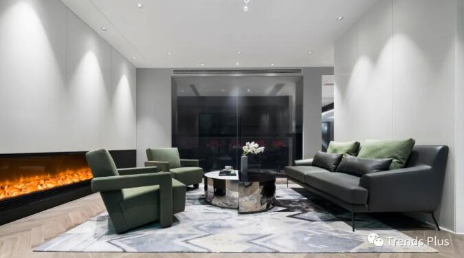 翡翠林梢青黛山,碧紗窗外水挪藍(lán),淺色的空間融入灰綠色的軟裝,建筑與室內(nèi)的氣質(zhì)彌漫開來。定制的麂皮絨沙發(fā),鏡面金屬和白色石材拼接而成的茶幾,藝術(shù)感彰顯無遺。黑色漸變玻璃隔墻,既是背景墻又是空間顏色最深的立面,讓茶水間在保持通透的同時又保證會客區(qū)客人的私密性。壁爐,火焰,回歸自然的同時讓氛圍變得輕緩,香茗與咖啡,讓辦公空間散發(fā)著靈魂的香氣。