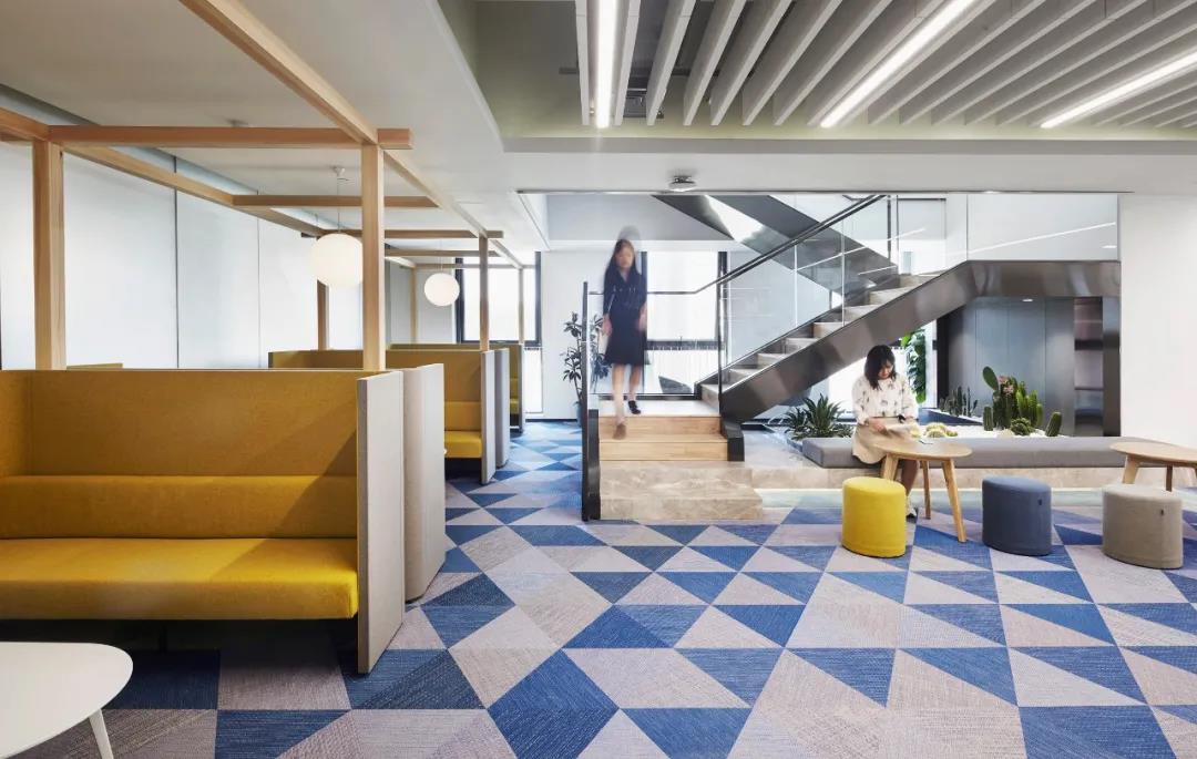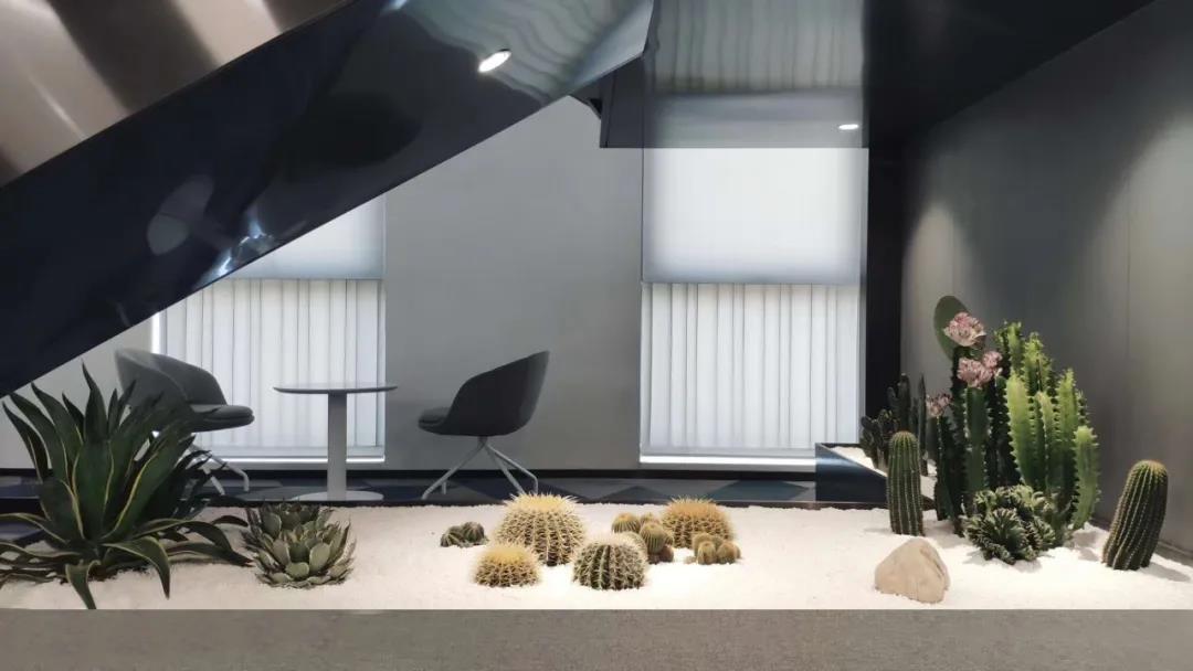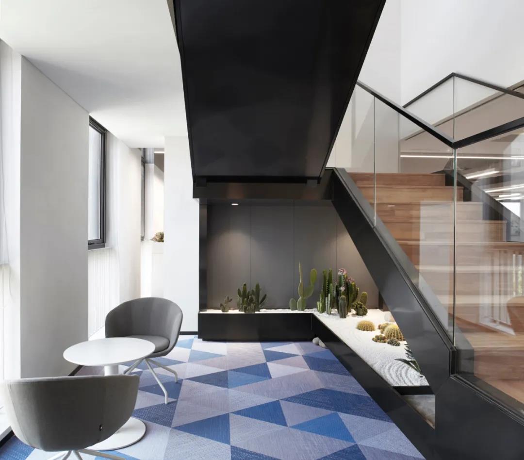 東側(cè)靠窗,面向花園的一面,布置休閑茶水區(qū),并打通部分樓層樓板,設(shè)步梯,促進(jìn)各部門之間交流,開展多場景辦公。