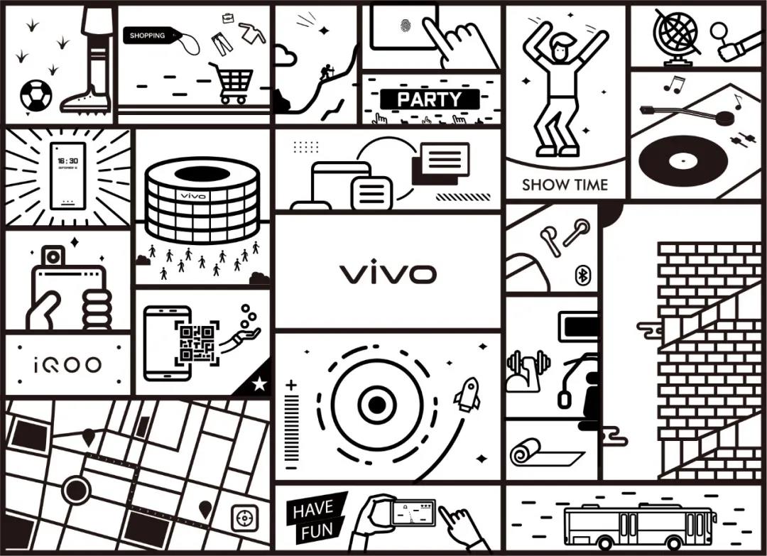 咖啡廳翻轉(zhuǎn)板設(shè)計(jì)的插畫,由vivo手機(jī)不同的使用場景組成,傳達(dá)品牌精神。