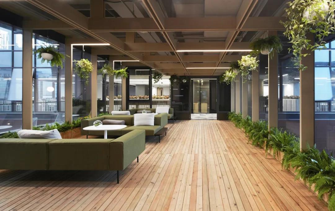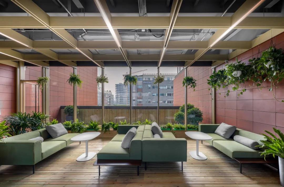 在建筑中段的4-6層,是一處半室外的連橋空間。通過結(jié)構(gòu)適度改造營建了三個(gè)疊落的空中花房,同時(shí)每個(gè)花房都配有戶外露臺作為空間延展。矩陣型木質(zhì)天花延伸到側(cè)墻并落地,地面鋪防腐木條,整個(gè)空間配備綠植,營造輕松、生態(tài)的戶內(nèi)外休憩空間,同時(shí)還可作為研討,舉辦小型活動的多功能空間使用。