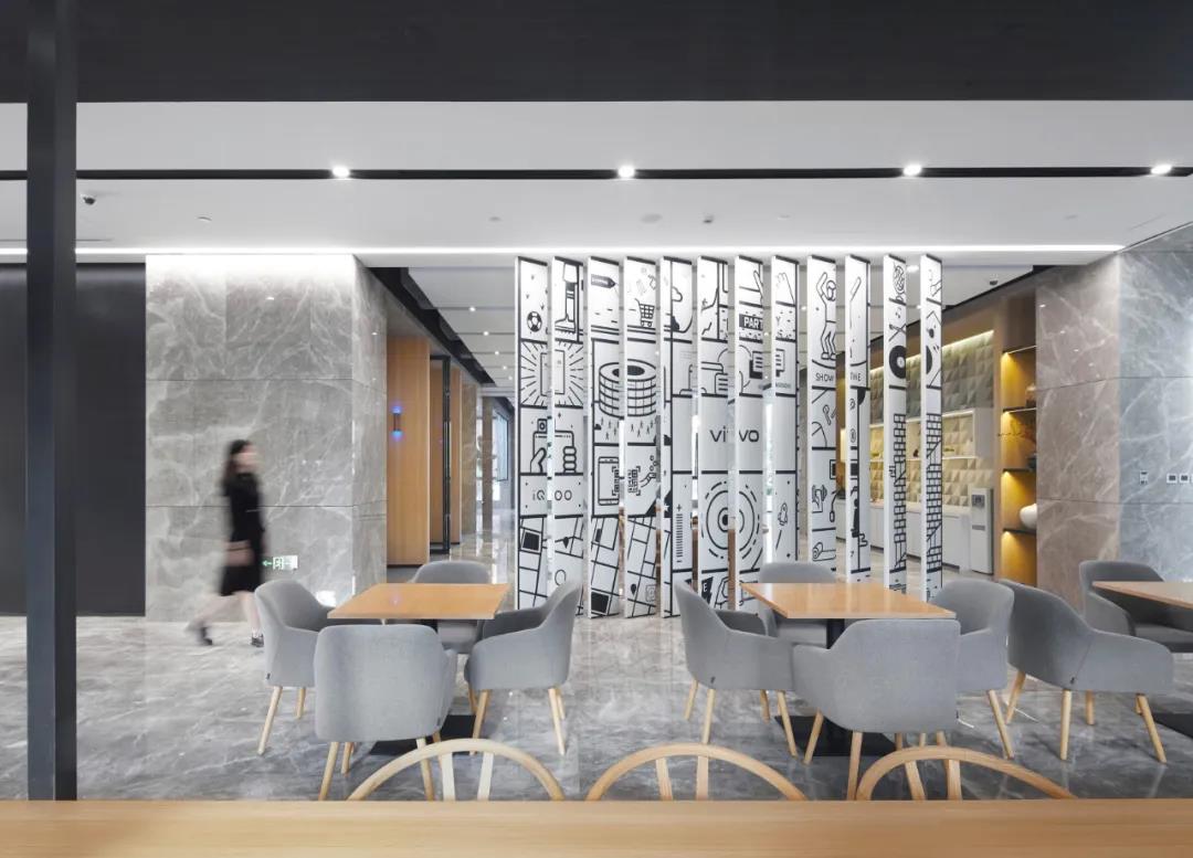 大堂作為整體的對外開放和形象展示空間,配備了咖啡,休閑茶水,展廳,洽談,會議等開放的功能性空間,配以圖像視覺傳達(dá)設(shè)計(jì),軟植入vivo品牌精神。
