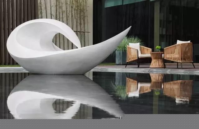 深灰色意大利火山石與柔和的沙發(fā)茶幾相得益彰,互為映襯。而光線照射進(jìn)來更是活躍了整個(gè)空間,落地窗外便是庭院。水景區(qū)域一只白天鵝正在梳理羽毛,而水畔一側(cè)的休息區(qū)域更是增添了一縷閑情逸致,營(yíng)造一種靜謐愜意的氛圍。