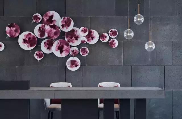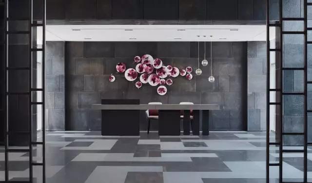預(yù)接待吧臺(tái)與大廳講究整體的對(duì)稱平衡,通過巧妙的吧臺(tái)構(gòu)成形式、空間吊燈的位置,呈現(xiàn)靈動(dòng)的立面關(guān)系,有效緩解空間的呆板。大面積深灰色石材,配以紫色壁飾花瓣式鋪灑開來,夾雜一絲神秘感,東方韻味無(wú)限彌散。
