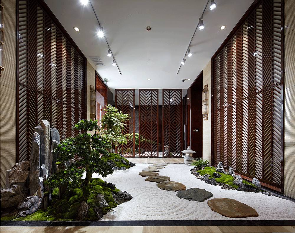 值得一提的是,走廊干景步道的景觀軟裝,一個集觀賞、生態(tài)、自然于一體的設(shè)計。小巧石籠、粒徑不等的灘石,旱濕均可培植的苔草地被,有機(jī)地組合在一起傳遞古樸自然的審美趣味,讓營銷中心的意境之美濃郁幾分。