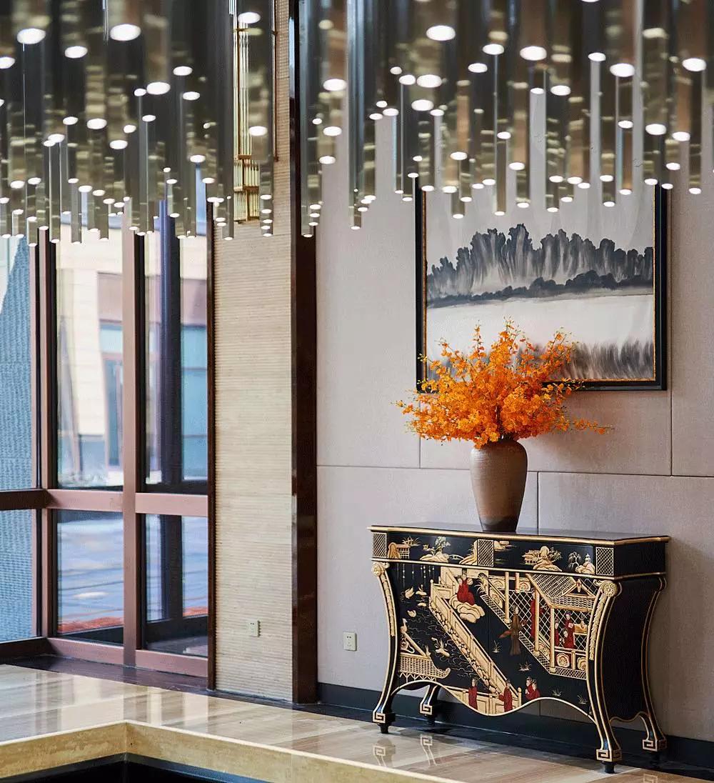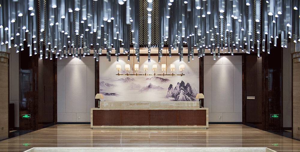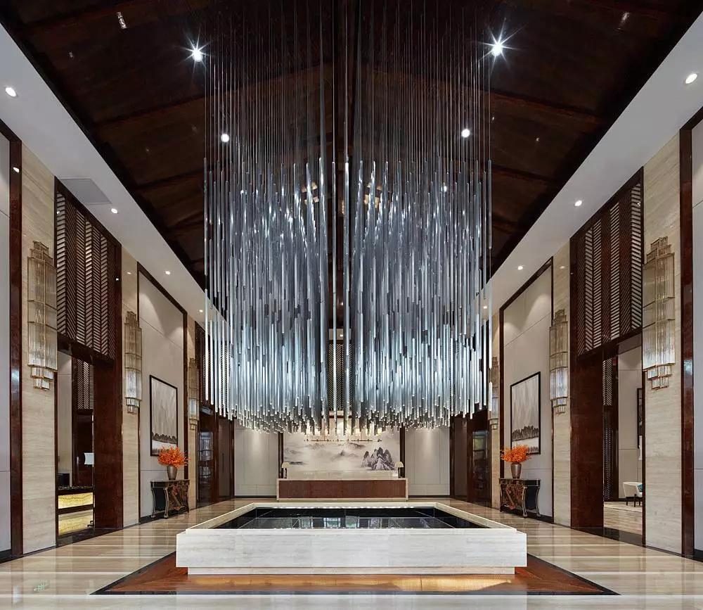 進(jìn)入大堂中心,便被一個奪人眼目的裝置藝術(shù)吸引,數(shù)百根不銹鋼條垂吊而下,宛如瀑布“飛流直下三千尺,疑是銀河落九天”,成為整個空間的視覺焦點(diǎn),啟動后,水珠從不銹鋼滴落到地景的水中,呈現(xiàn)出“大珠小珠落玉盤”的動感。