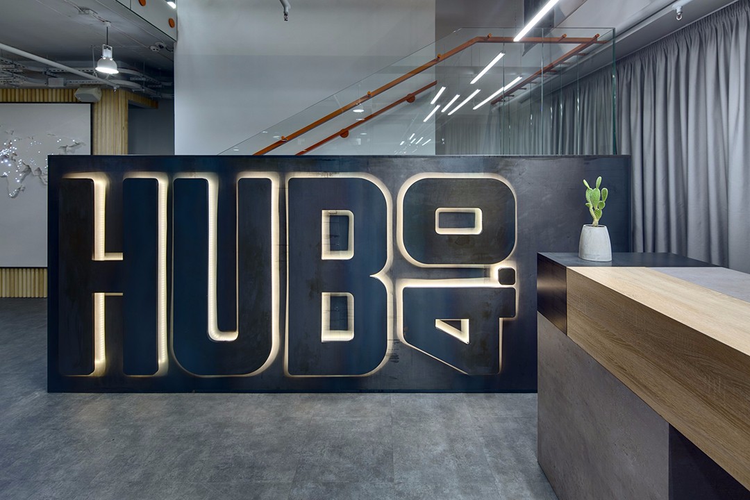 整個空間共有三層。一層空間將有照明的大型金屬logo面板緊貼玻璃樓梯圍欄設置,歡迎客人的到來,并通過動態(tài)照明來強調(diào)出長接待臺。